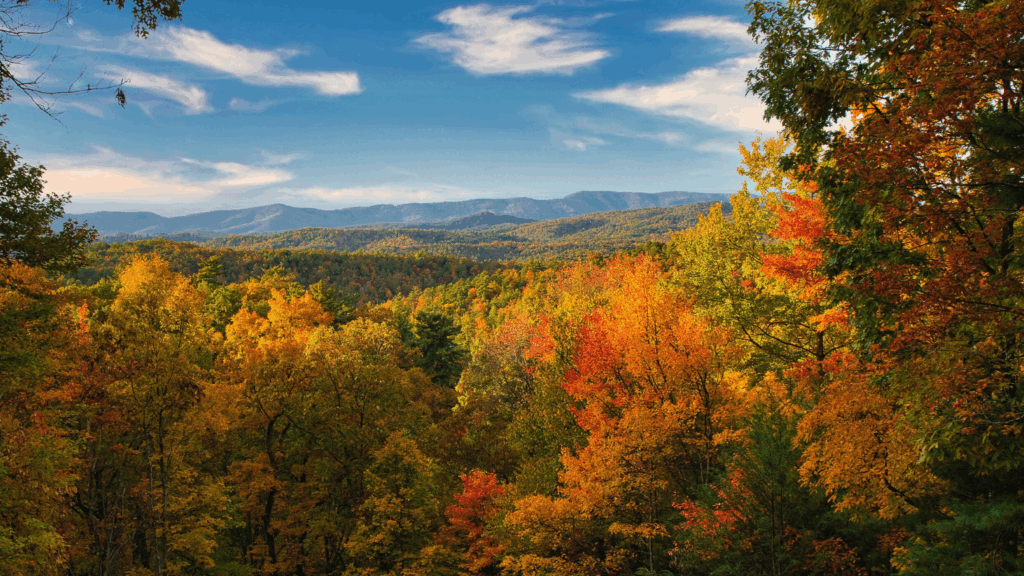 Shenandoah National Park, with its Skyline Drive running the length of the park, offers one of the best autumn drives in the United States. From late September to November, the park’s 200,000 acres are ablaze with the colors of fall. Over 1,300 species of plants contribute to the vivid display, with oaks, maples, and hickories standing out. Numerous overlooks provide spots to pull over and soak in the expansive views. The cooler temperatures and clear skies make hiking and camping highly enjoyable, adding to the appeal of a fall visit.